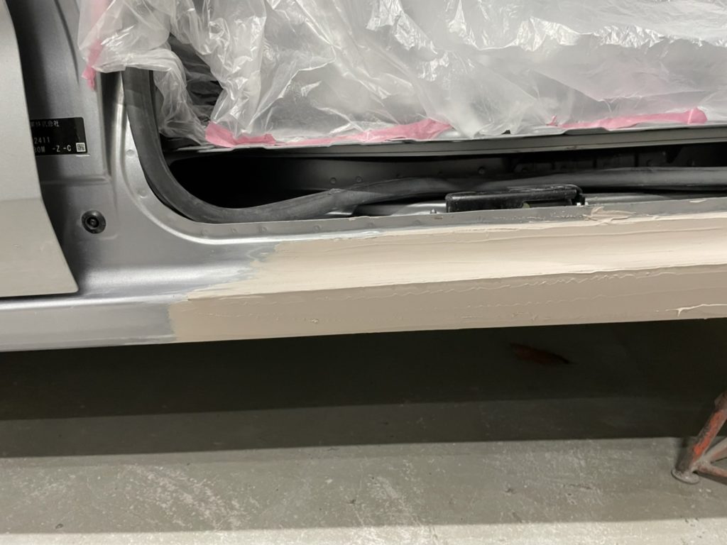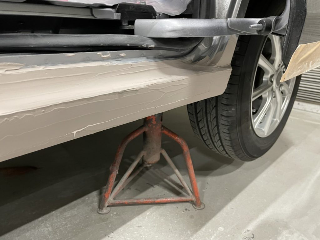 しかし一筋縄ではいかない修理でもあります。ロッカー部分というのは断面図がコの字型というか箱状の形状なのでドアの凹み等に比べると板金の難易度高し、