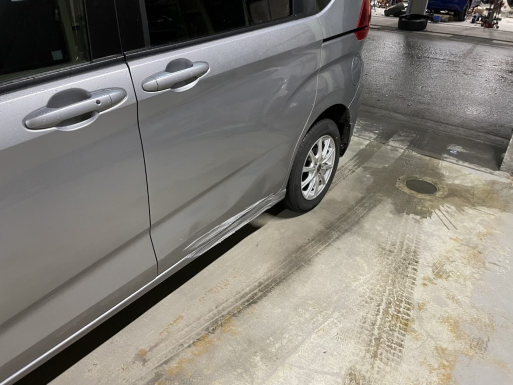 こちら。左後ろ側のサイドシル(ロッカーパネル)部分。ドアの下部もイッてしまってます。前回のトヨタヴィッツと同様です。