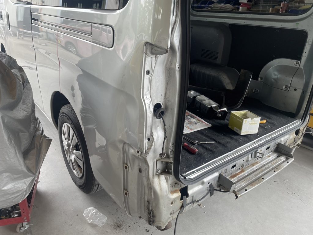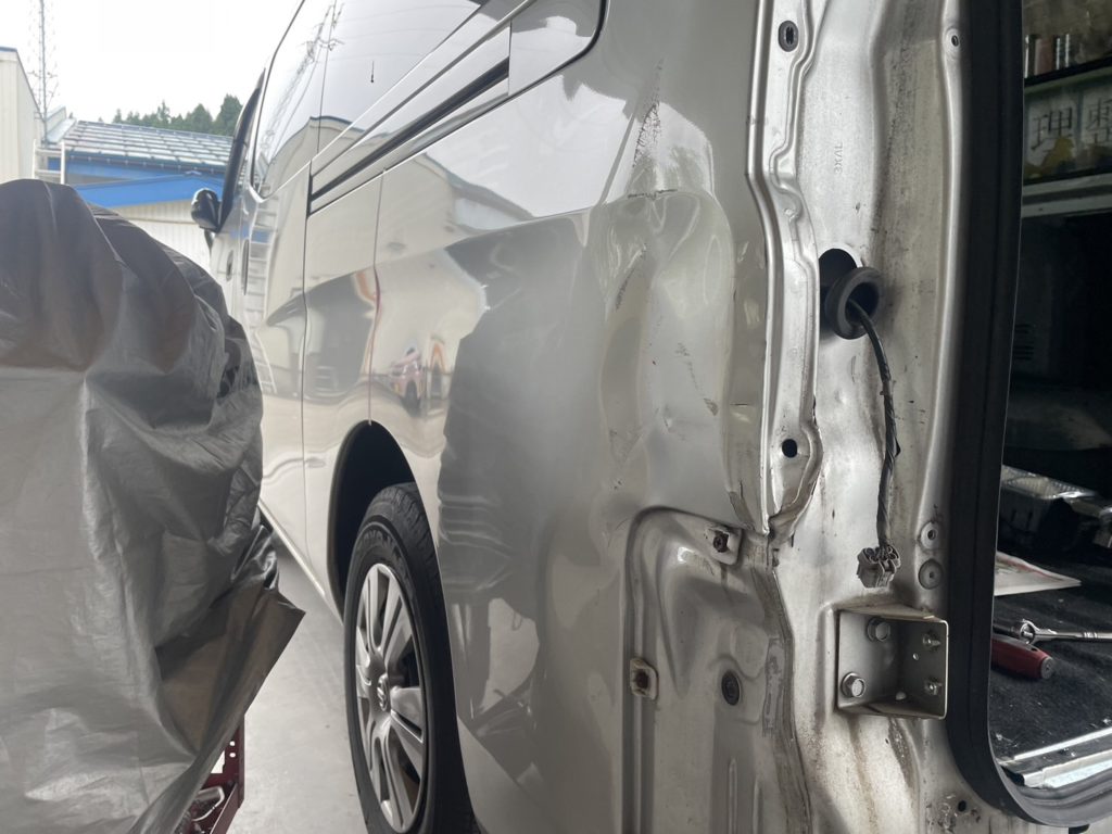 次は一番酷いこのひしゃげ。クォーターパネル全交換という手もあるのですがコスト的に今回は板金塗装で直します。