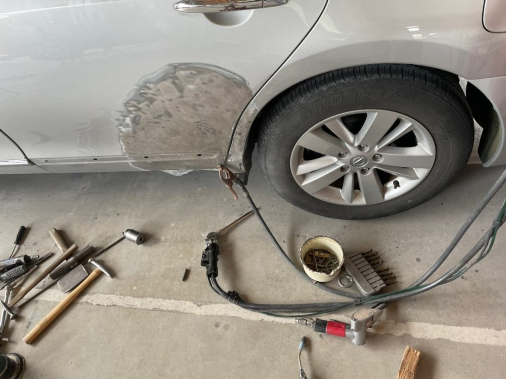 新潟県長岡市栃尾にある自動車板金屋のオートリペアオオサキです。修理や塗装は当社におまかせください!本日はニッサンのティアナです。左後ろドア、クォーターパネル、ホ…