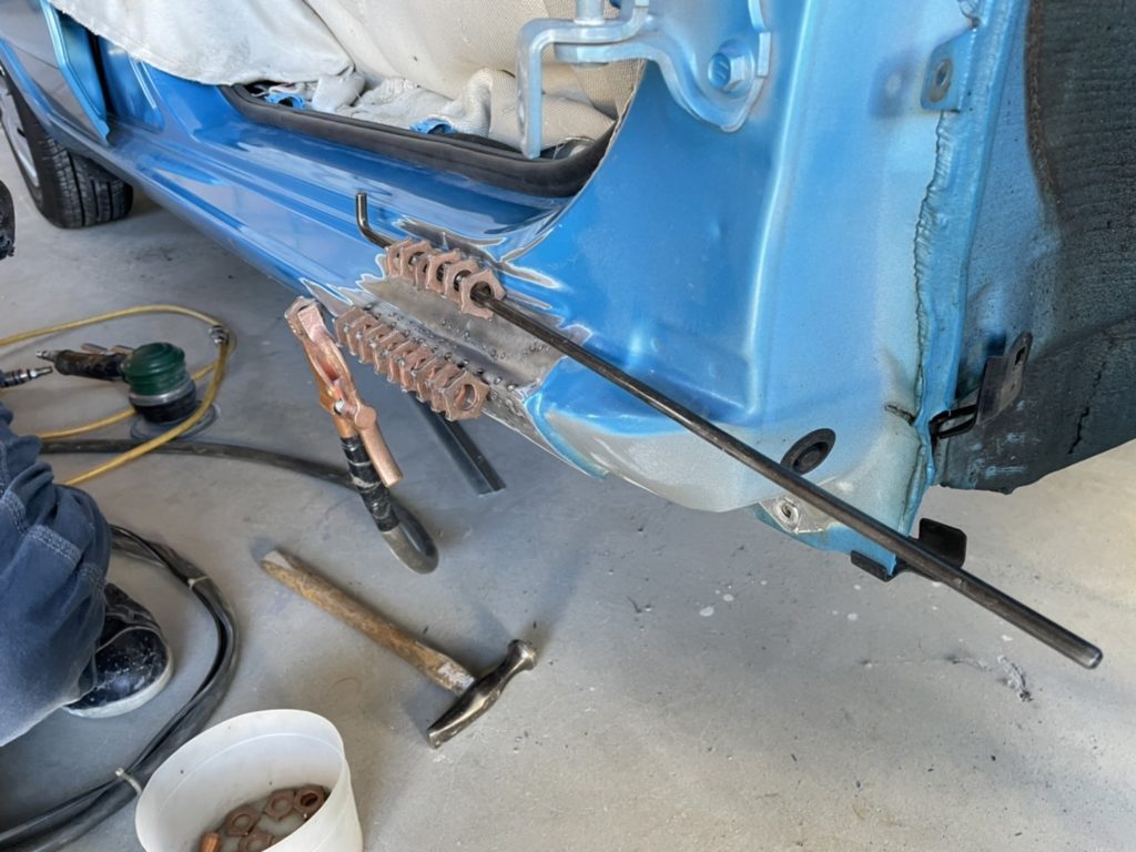 大きく凹んでる部分をまずは引張り出します。金属の棒や治具を直接凹み部分に溶接して引っ張る!